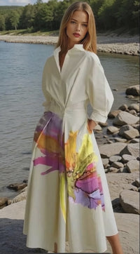 Es una opción encantadora y práctica para cualquier ocasión. Con su diseño elastico y cuello pico, este vestido combina comodidad y funcionalidad. El tejido elastane satinado  facilita el vestirse, mientras que la falda acampanada añade un toque de estilo femenino. Fabricado en una mezcla de poliéster y algodón licra satinado , este vestido ofrece una sensación suave y cómoda.